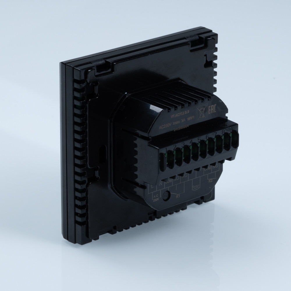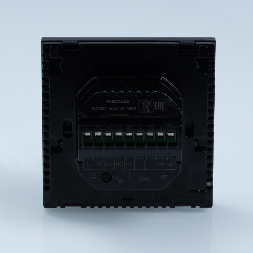 (VT.AC712.B) Хронотермостат электронный комнатный с Wi-Fi (Wi-Fi-хронотермостат) предназначен для подачи управляющего сигнала (включить/выключить) на регулирующие устройства водяного теплого пола или радиаторного отопления. Управление осуществляется в зависимости от температуры воздуха в помещении (встроенный датчик) и температуры пола (выносной датчик, входит в комплект). Возможны недельное программирование и выбор режима работы – по датчику температуры воздуха или датчику температуры пола.