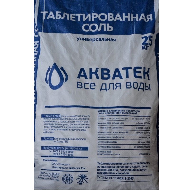 Соль таблетированная NaCI, пр-во Россия (25кг) АКВАТЕК