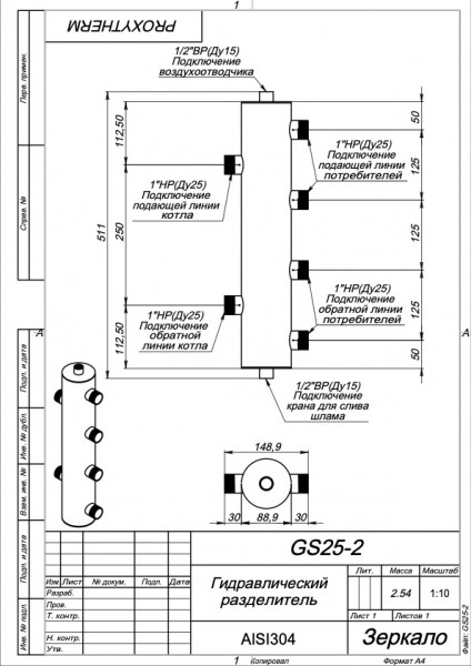 Гидравлический разделитель ПРОКСИТЕРМ из нерж. стали GS 25-2 60 кВт, 2 контур