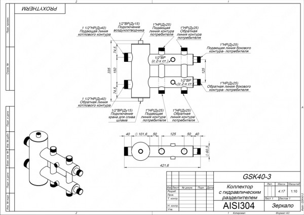 Коллектор с гидроразделителем ПРОКСИТЕРМ из нерж. стали GSK 40-3 120 кВт 3 контур