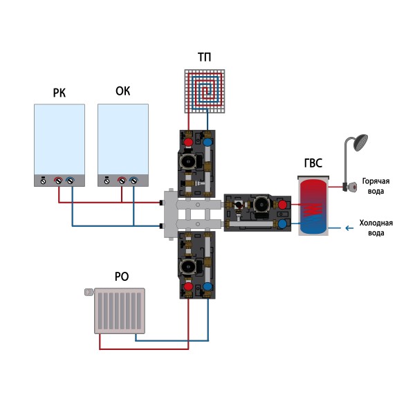 Распределительный коллектор предназначен для устройства систем отопления с тремя потребителями тепла с различными параметрами расхода и температуры теплоносителя. Состоит из подающего и обратного коллекторов, расположенных друг над другом.