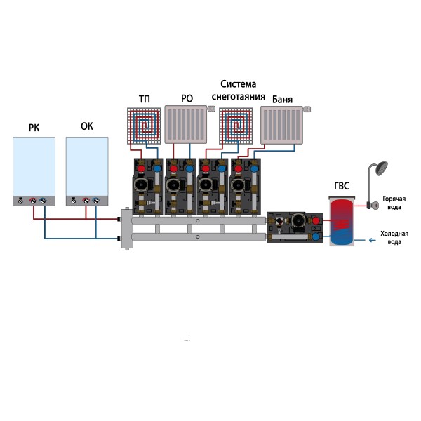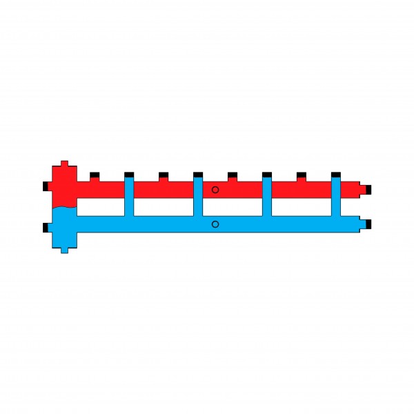 Распределительный коллектор предназначен для устройства систем отопления с тремя потребителями тепла с различными параметрами расхода и температуры теплоносителя. Состоит из подающего и обратного коллекторов, расположенных друг над другом.