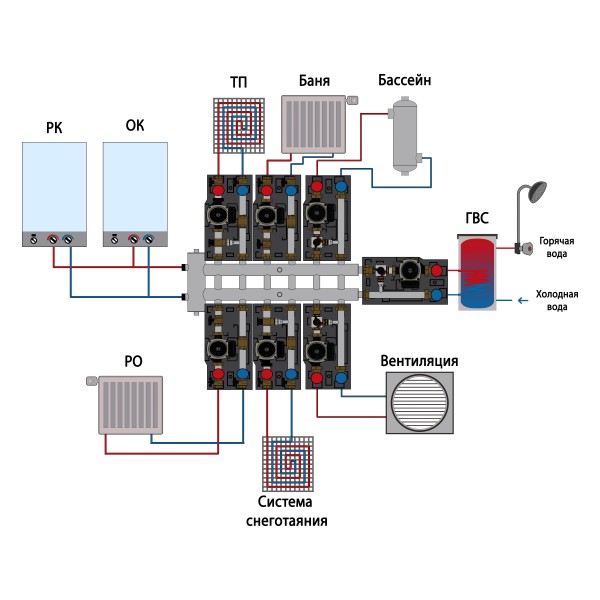 Распределительный коллектор предназначен для устройства систем отопления с тремя потребителями тепла с различными параметрами расхода и температуры теплоносителя. Состоит из подающего и обратного коллекторов, расположенных друг над другом.
