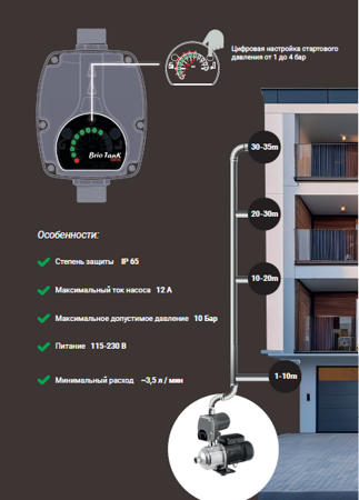 • Автоматически управляет запуском электронасоса при снижении давления (открытие кранов) и его остановкой при прекращении потока жидкости при максимальном давлении (закрытие кранов)