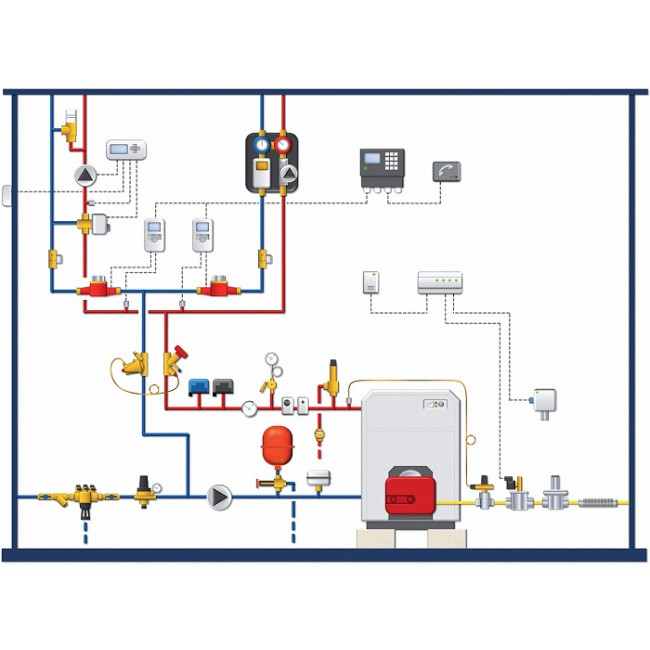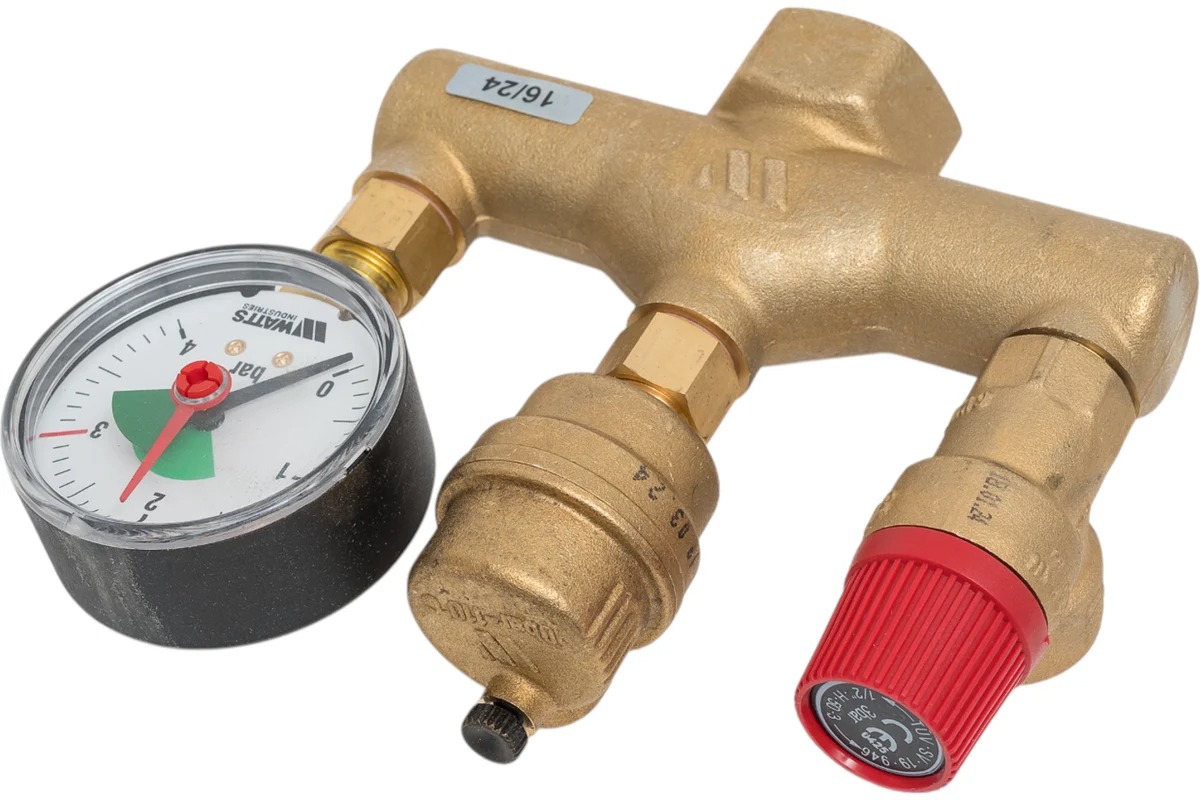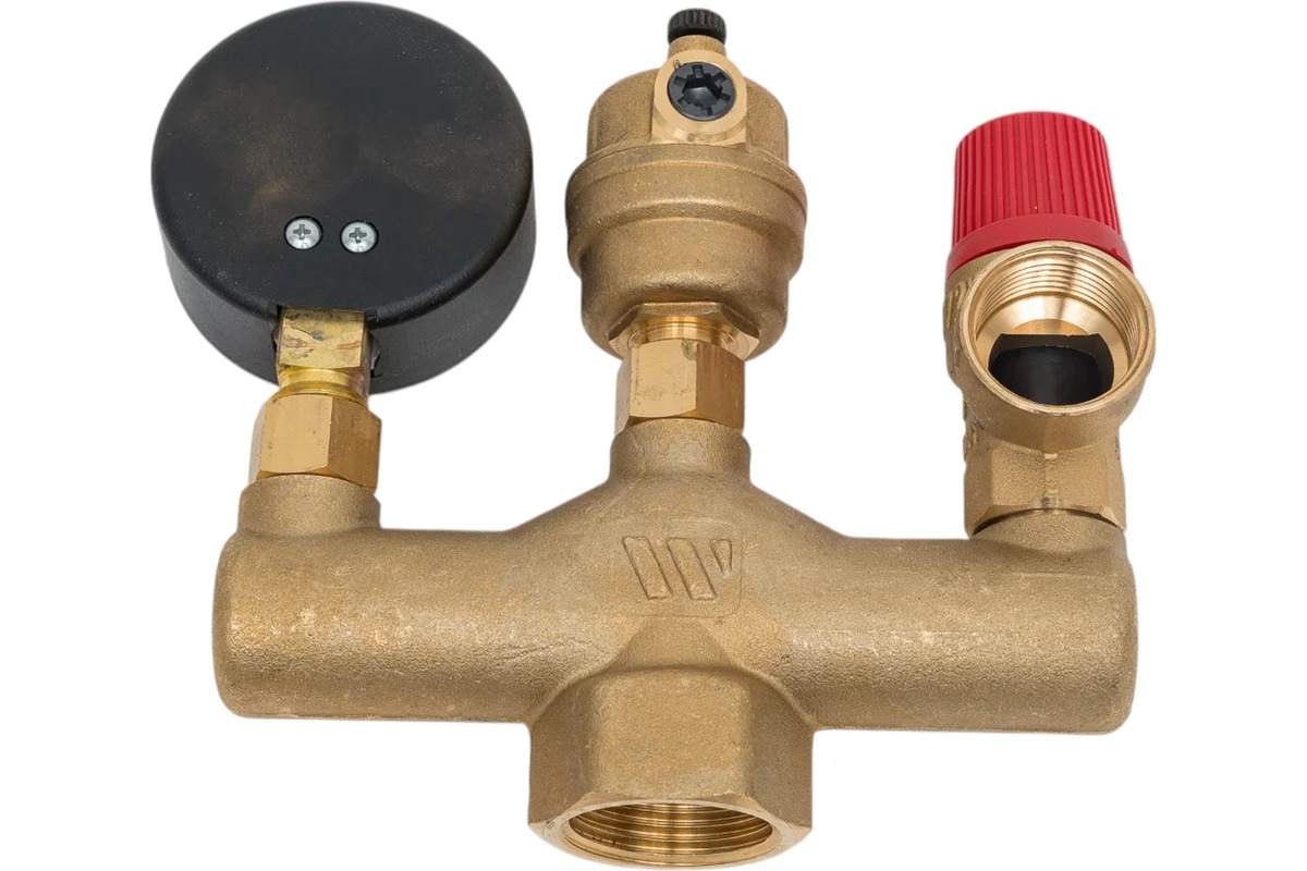 Группа безопасности котла для защиты закрытых систем отопления до 50 кВт. Включает в себя предохранительный клапан с порогом срабатывания 3 бара, автоматический воздухоотводчик (с запорным клапаном) MKV10R и манометр MH R63/4-3/8", установленные на латунной консоли (в теплоизолирующем кожухе). Подключение 1" ВР.