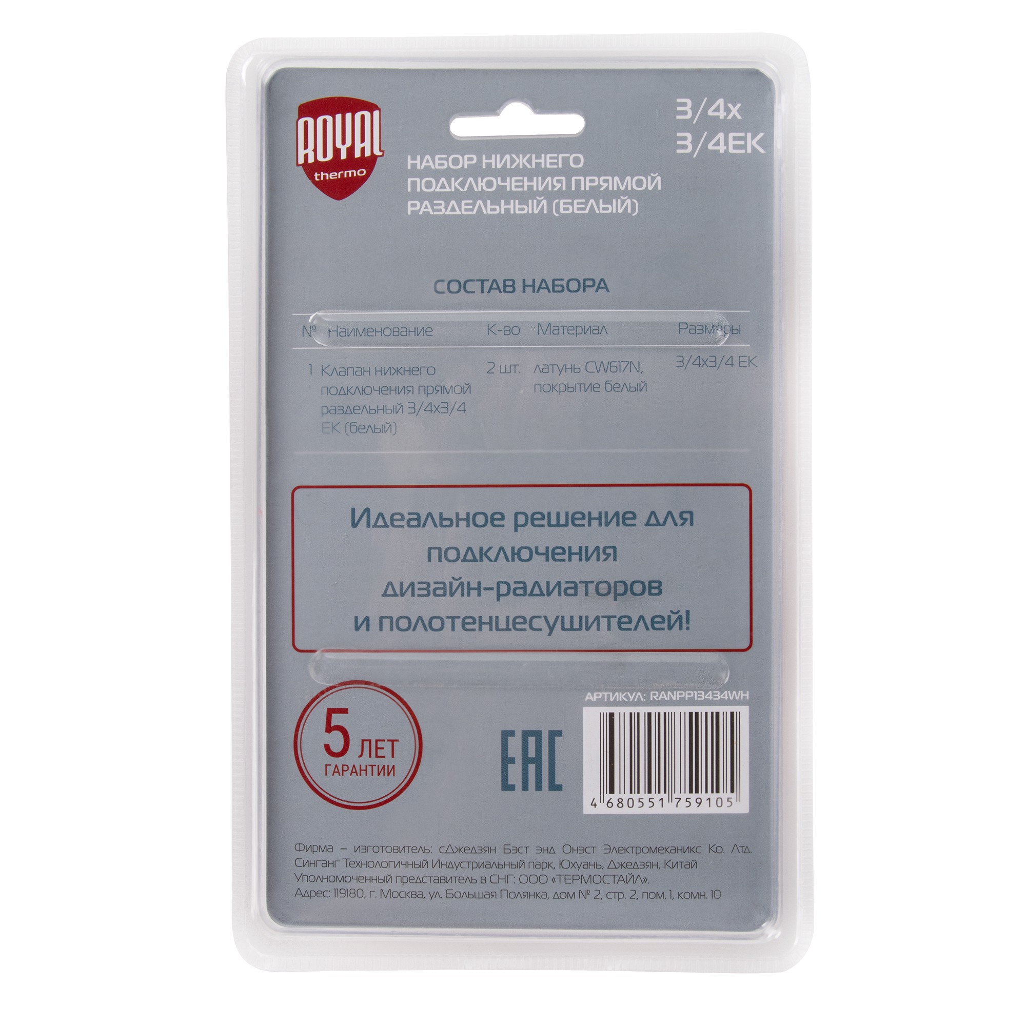 Набор нижнего подключения Royal Thermo прямой раздельный 3/4х3/4ЕК (белый)