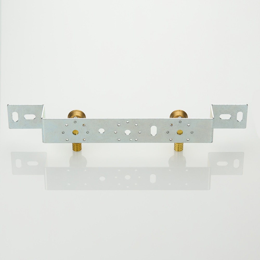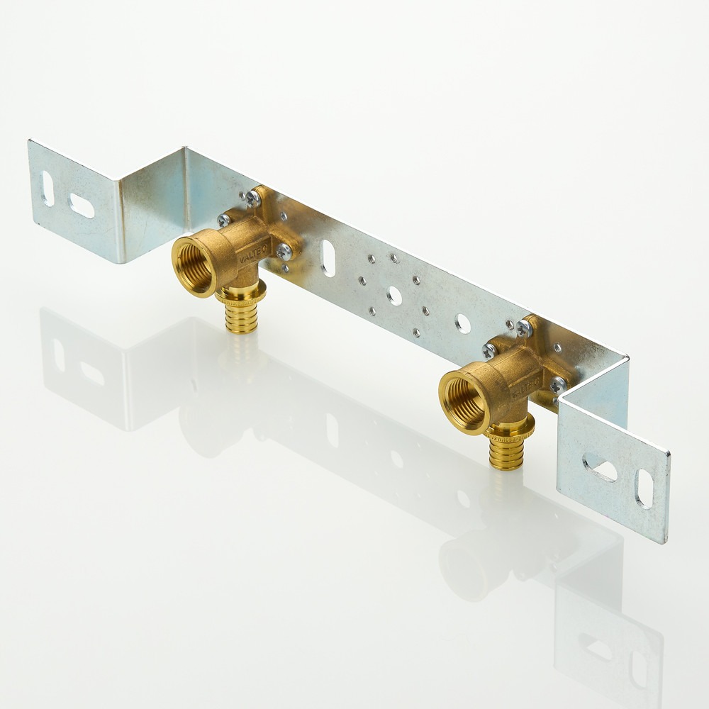 (VTm.424.G) Пластина монтажная (монтажная планка) с аксиальными водорозетками (угловыми аксиальными фитингами с креплениями), предназначенная для крепления данных соединителей к строительным конструкциям – стенам, перекрытиям, колоннам. Обеспечивает жесткую фиксацию водорозеток под углом 45; 90; 135⁰. Поддерживает установку смесителей со стандартным межосевым расстоянием 150 и 75 мм.