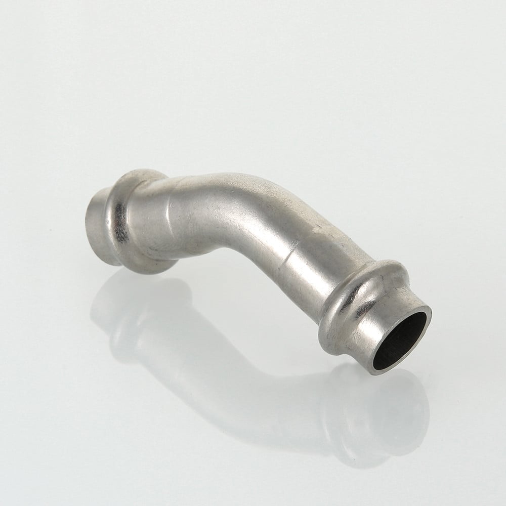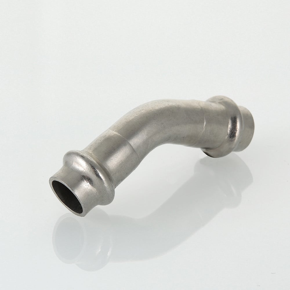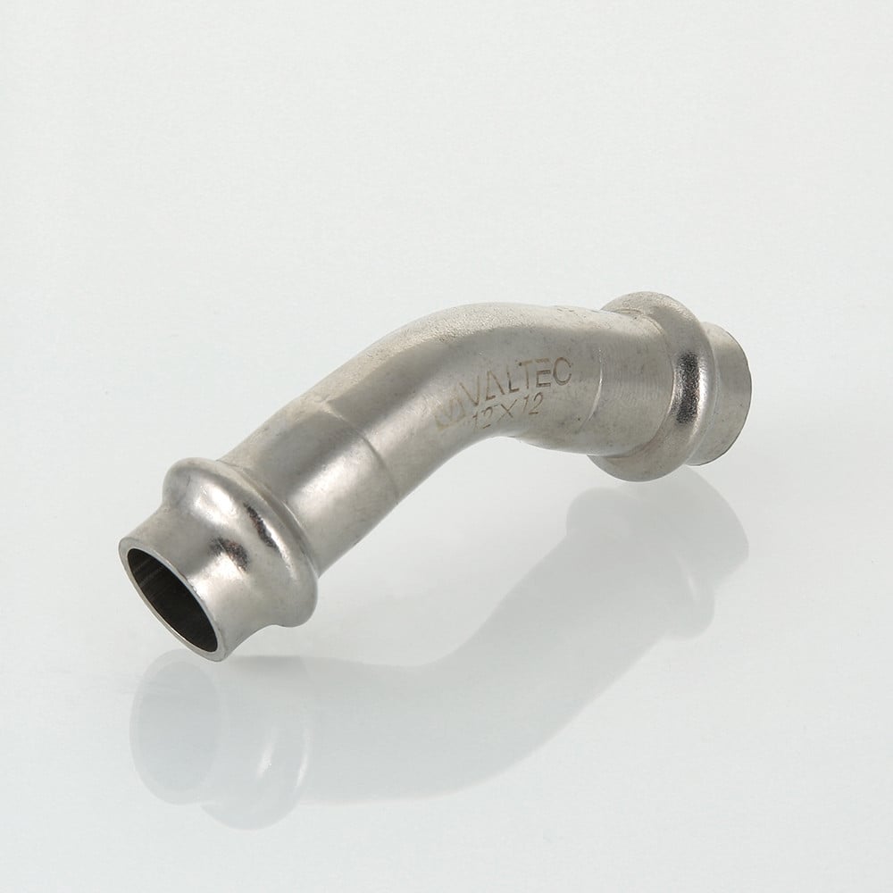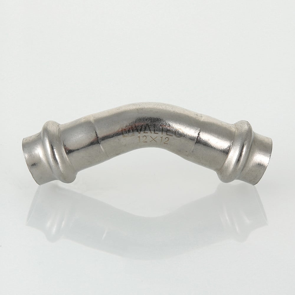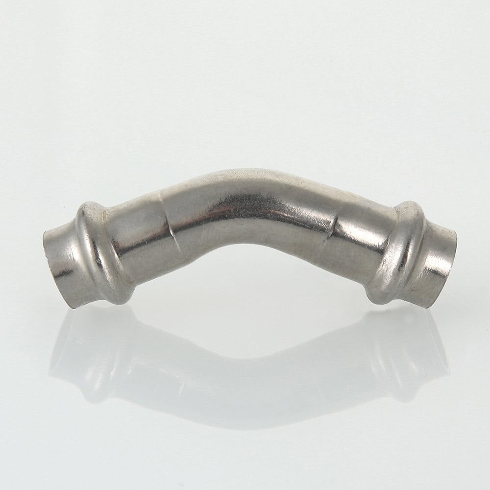 (VTi.959.I) Двухраструбный угольник 45° из нержавеющей стали обеспечивает соединение тонкостенных стальных труб систем водоснабжения, отопления, иных инженерных и технологических установок с рабочей температурой до 120 °С и давлением до 16 бар. Изделие изготовлено из стали AISI 304. Материал уплотнительных колец – эластомер EPDM. Отдельно можно приобрести уплотнительные кольца из FPM (витон); в этом случае максимальная рабочая температура увеличивается до 140 °С.