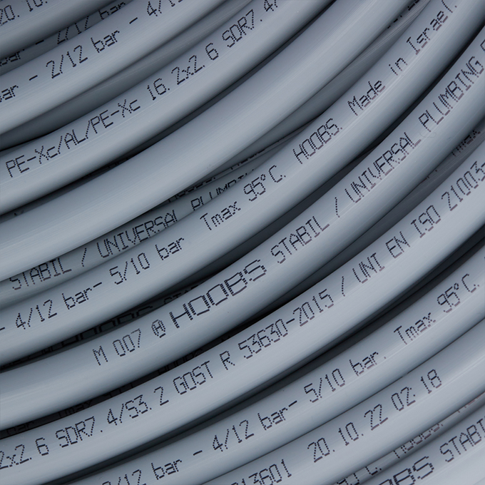 Труба металлополимерная из сшитого полиэтилена Hoobs Stabil PE-Xc/Al/PE-Xc с барьерным алюминиевым слоем предназначена для строительства и ремонта внутренних сетей холодного, горячего водоснабжения и отопления, в том числе радиаторного и напольного отопления согласно ГОСТ 53630-2015.